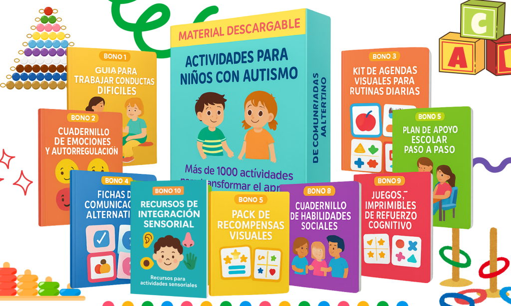 Es un pack digital que reúne más de 1000 actividades, fichas, pictogramas, juegos y guías diseñadas para apoyar el desarrollo de niños con Autismo y TDAH, tanto en casa como en la escuela o en terapia.